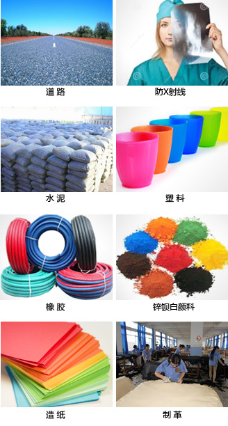 ④ 在工业化填料中:在油漆工业中,重晶石粉填料可以增加漆膜厚度、强度及耐久性。 在造纸、橡胶、塑料领域,重晶石料能提高橡胶和塑料的硬度、耐磨性及耐老化性; 锌钡白颜料也用于制造白色油漆,在室内使用比铅白、镁白具有更多的优点。